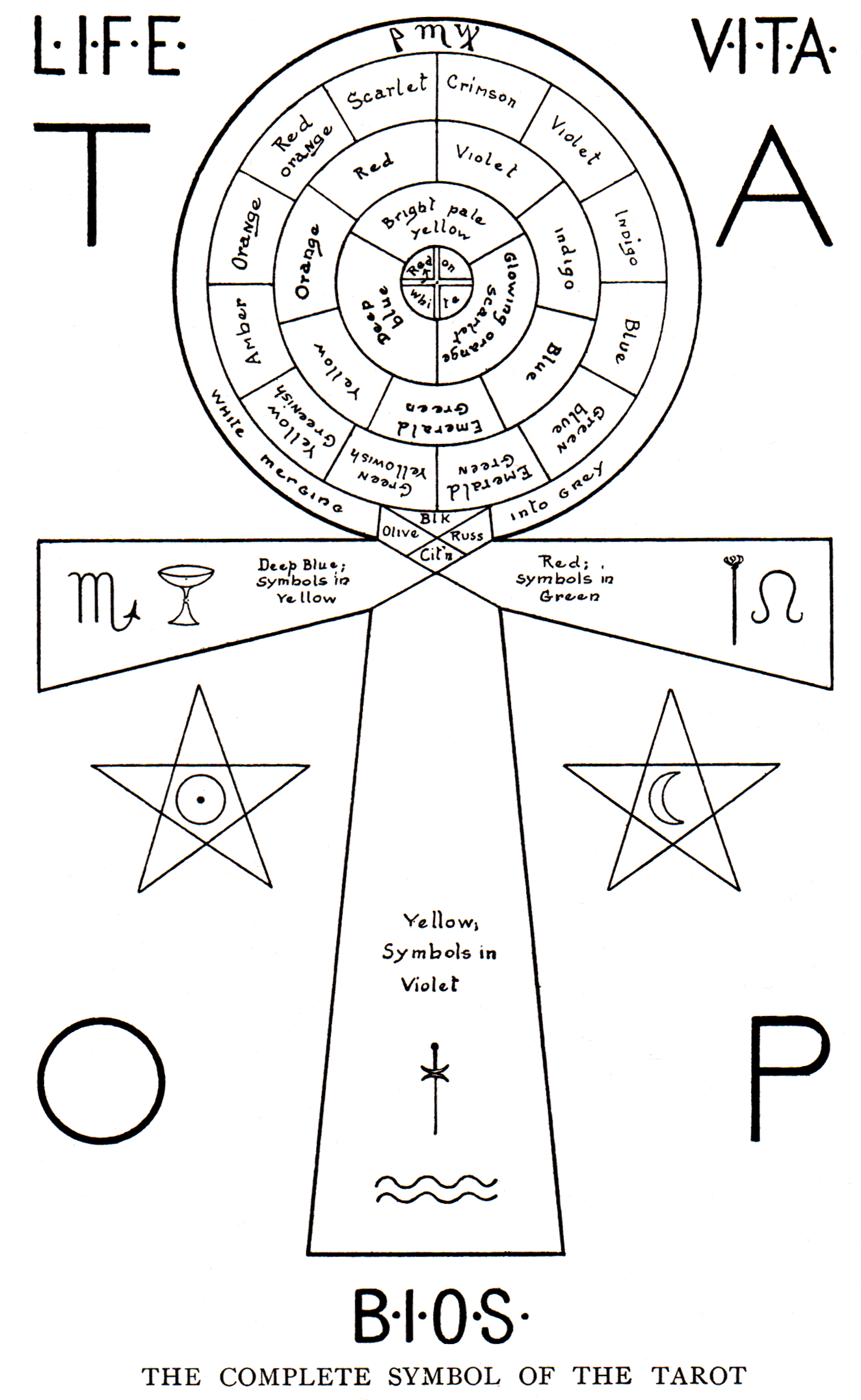 The whole space in the ring contains the Rose of 22 Petals bearing the Names of the 22 Keys. In the centre a white circle, and a red cross of four equal arms.